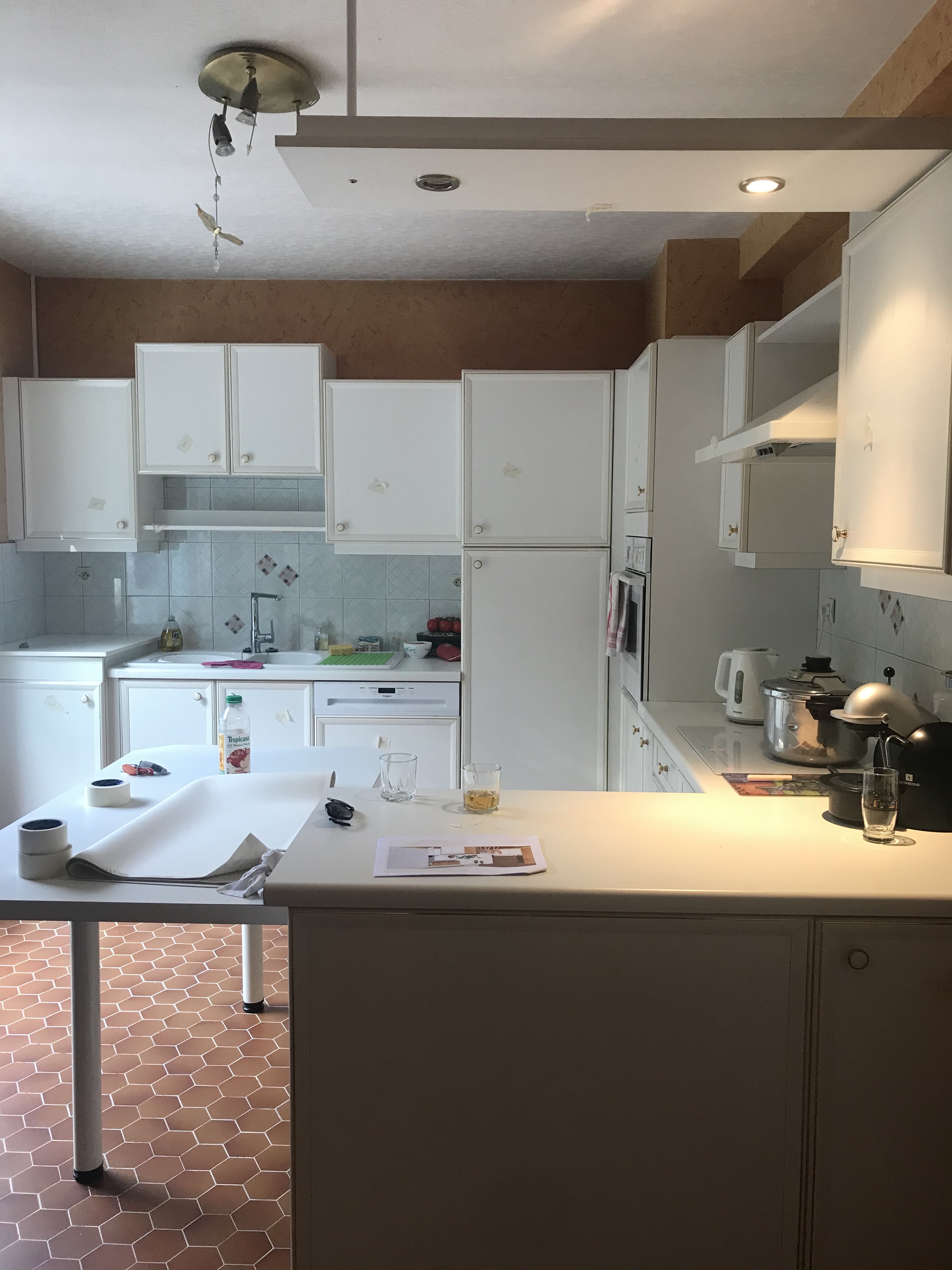 Rénovation de cette jolie cuisine, avec une nouvelle circulation. Une très belle base avec ces tommettes existantes et quelques meubles de cuisine conservés. On associe à cela des matériaux nobles comme le chêne, le marbre et le laiton. Pour la touche graphique on travail avec des façades rainurées.