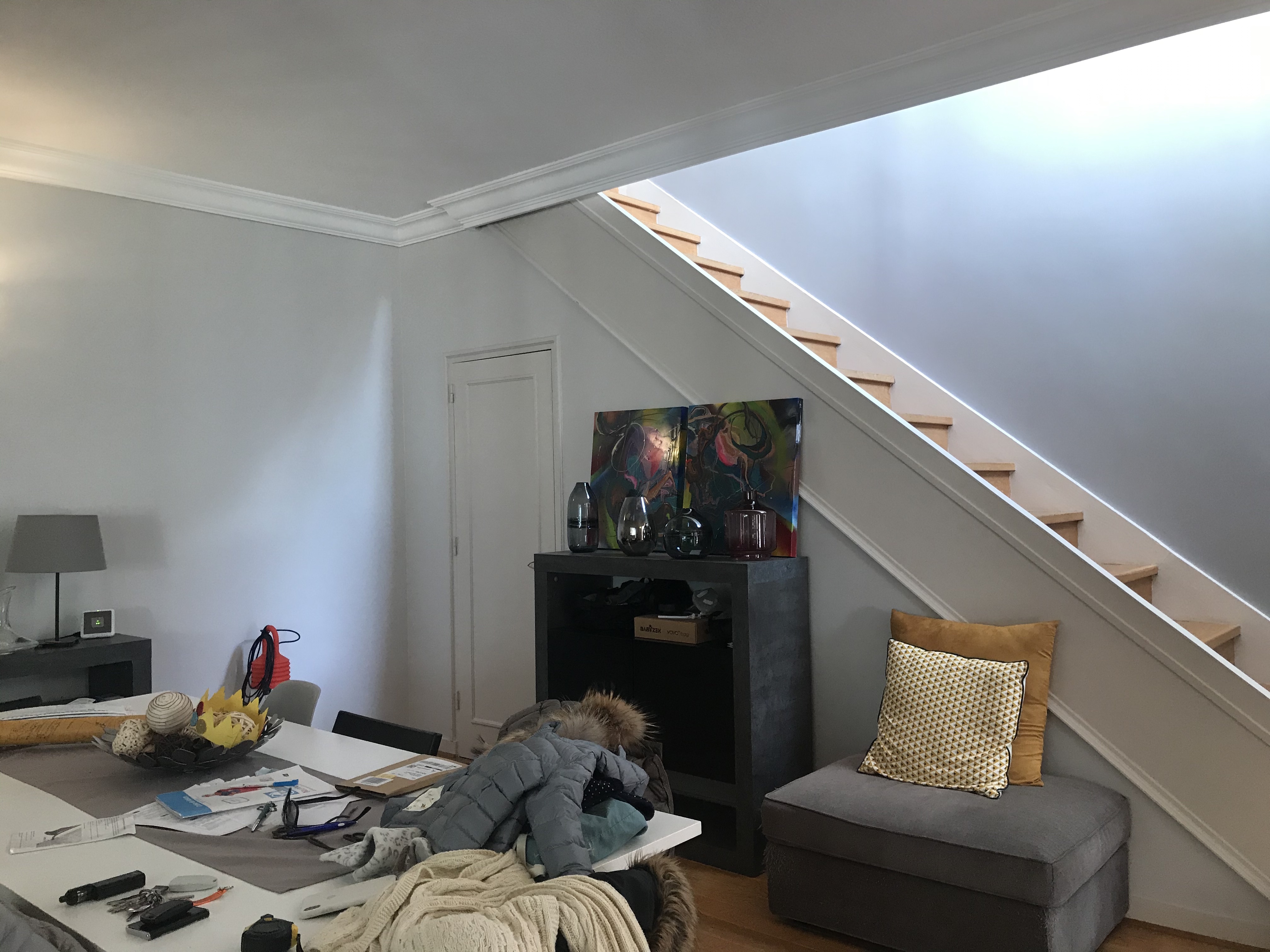 Rénovation de cette salle à manger, l’équipe des imagineurs à mis à profit toute sont imaginations pour créer des meubles complètement sur mesures. Une bibliothèque dessinée avec une belle symétrie et un effet suspendu. Une très grande table aux belles lignes courbes et un garde-corps tout en courbe également qui invite à monter à l’étage. Sans oublié les éléments clefs de la décorations de cette pièce, entre chaises et luminaires.