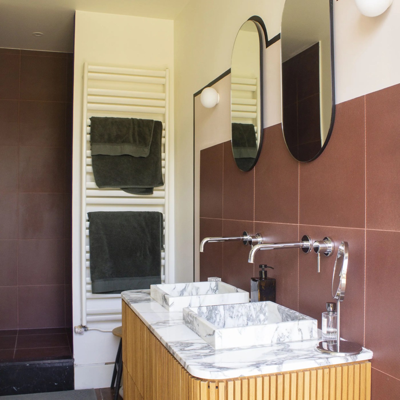 Dans une maison des années 20, cette salle de bain se voit parée d’un look rétro très graphique. On joue sur les lignes avec un liseré noir, un meuble vasque dessiné sur mesures en tasseaux, les beaux carreaux des designers Bouroulec, un plan et travail avec vasques façonnées en marbre blanc pour une salle de bain unique.