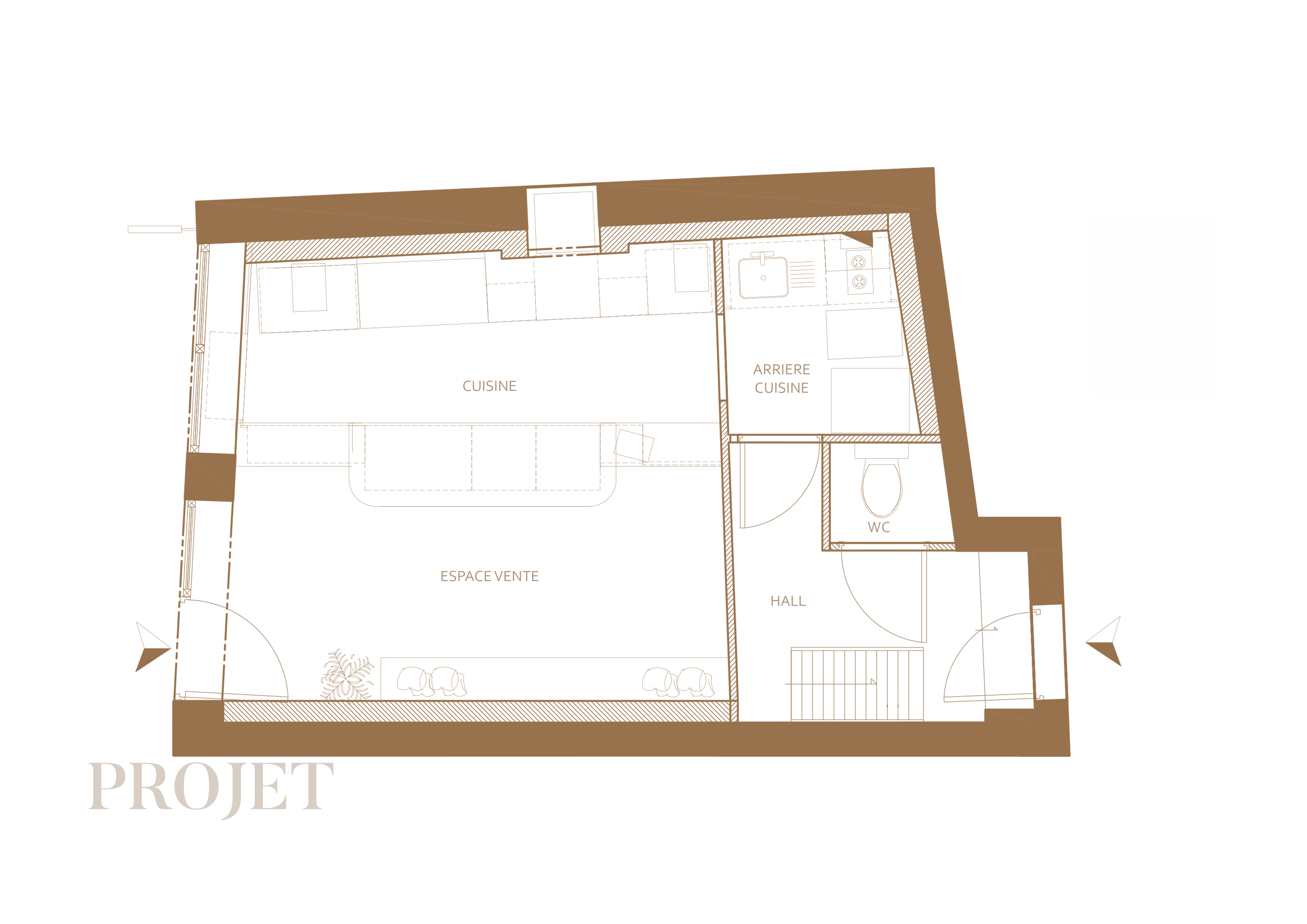 Un local commercial à l’abandon prend vie, grâce à l’expérience Just Cookie’s. Ces délicieux cookies pâtissiers vont occuper les lieux suite une rénovation alliant courbes et coloris issus du cookie. Un atelier boutique, pour confectionner ces petits bijoux, dans un cadre sérénité, un enveloppement dans une teinte blanc cassé faisant écho au lait ou la crème, du terrazzo pour le côté pépites de chocolats, les courbes pour la forme du cookie, puis une teinte marronné mettant l’eau à la bouche. Plus qu’à profiter de la terrasse extérieur pour déguster !