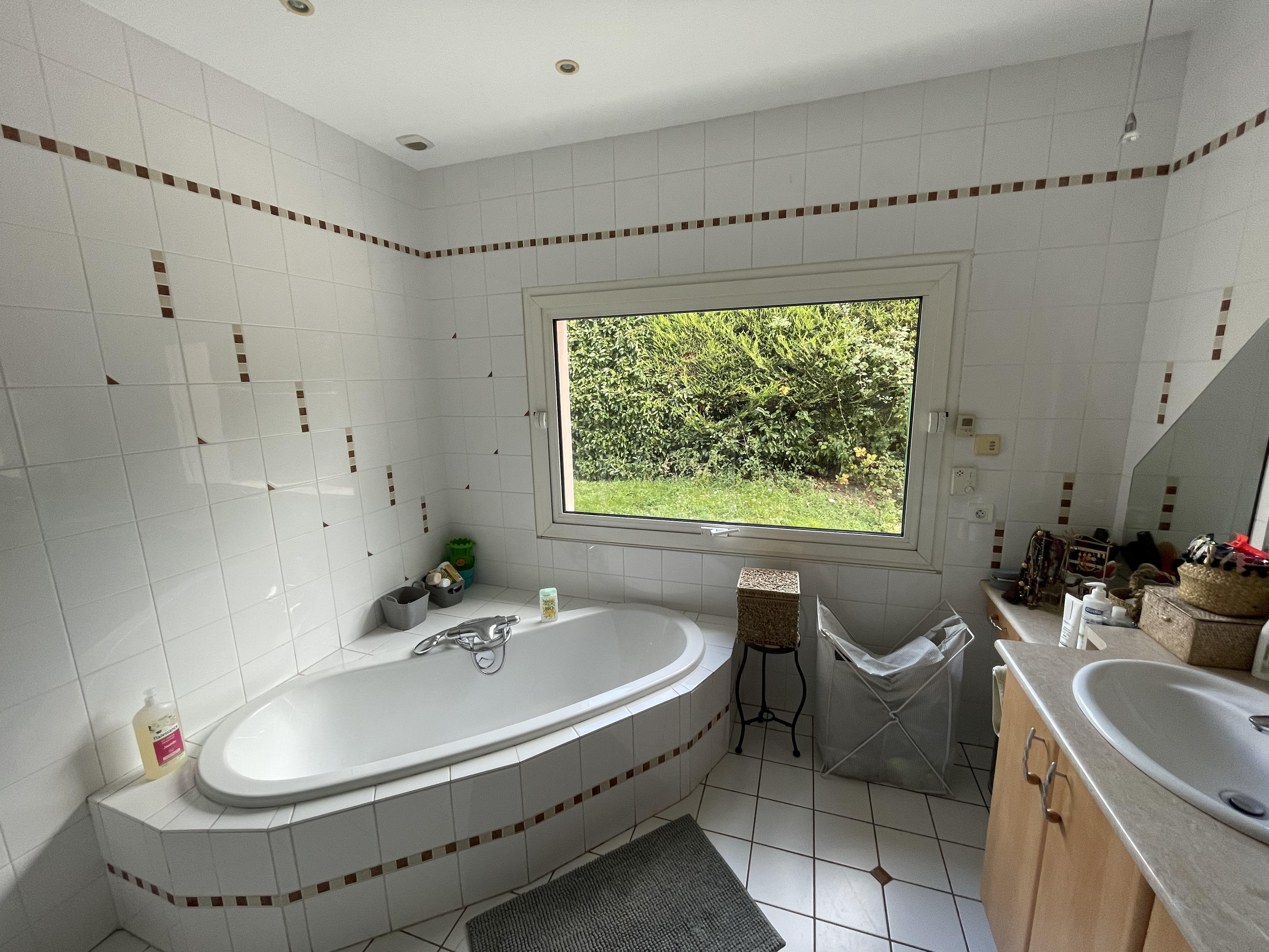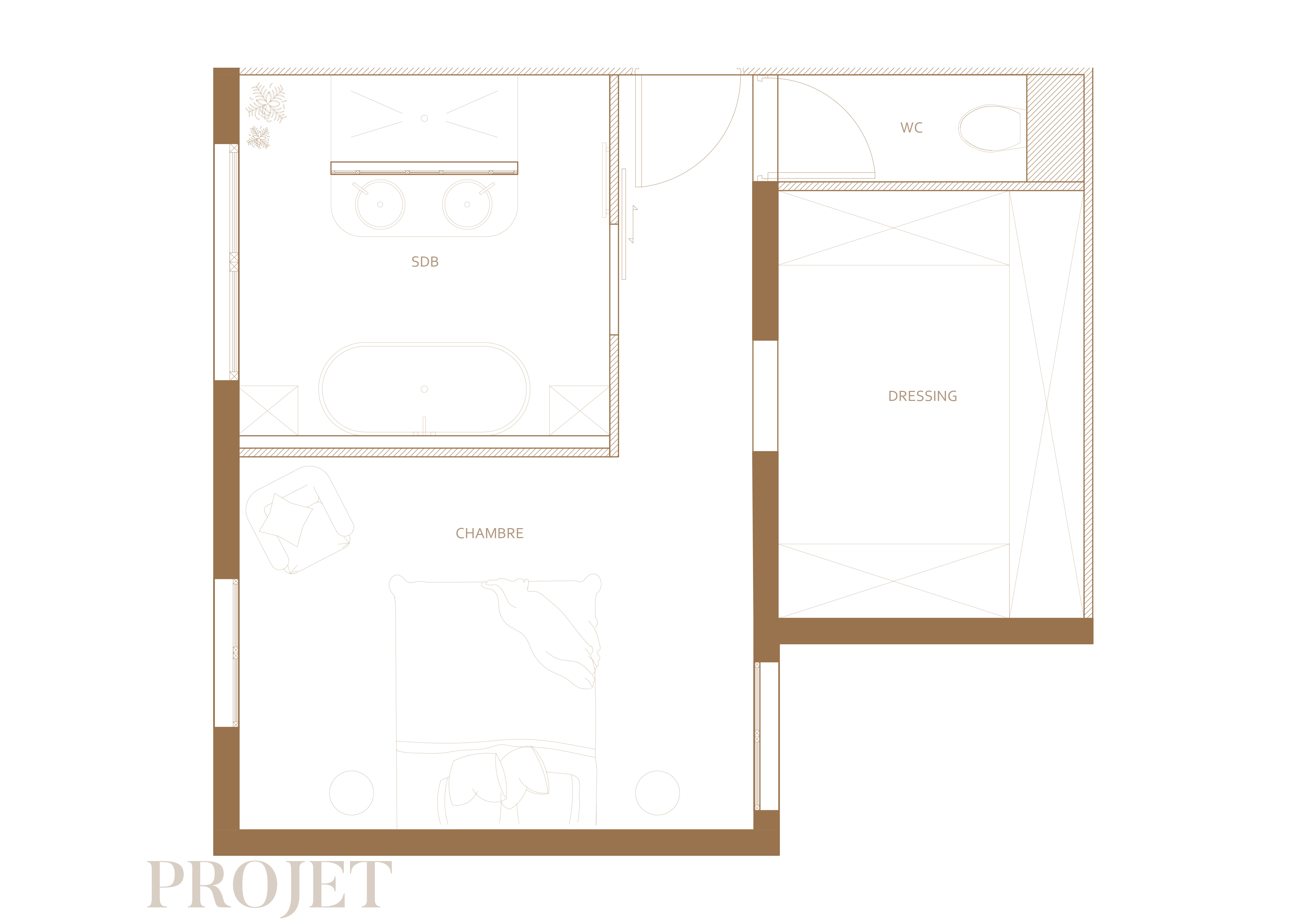 Une suite parentale démodée se voit retrouver ses lettres de noblesse, par la restructuration des espaces. Une teinte verte chaude, comme fil conducteur, pour une uniformité et beaucoup de caractère. Associé à un noyer, des carreaux nuancés et des touches de laiton, la salle de bain devient un joli bijou. Un espace complètement remodeler avec une cloison centrale, surmontée d’une verrière sur mesure, dissociant la douche de l’espace vasque. Son dressing sur mesure assortie, jusqu’aux poignées dessinées spécialement pour le projet, en alternance de noyer et de verre fumé.