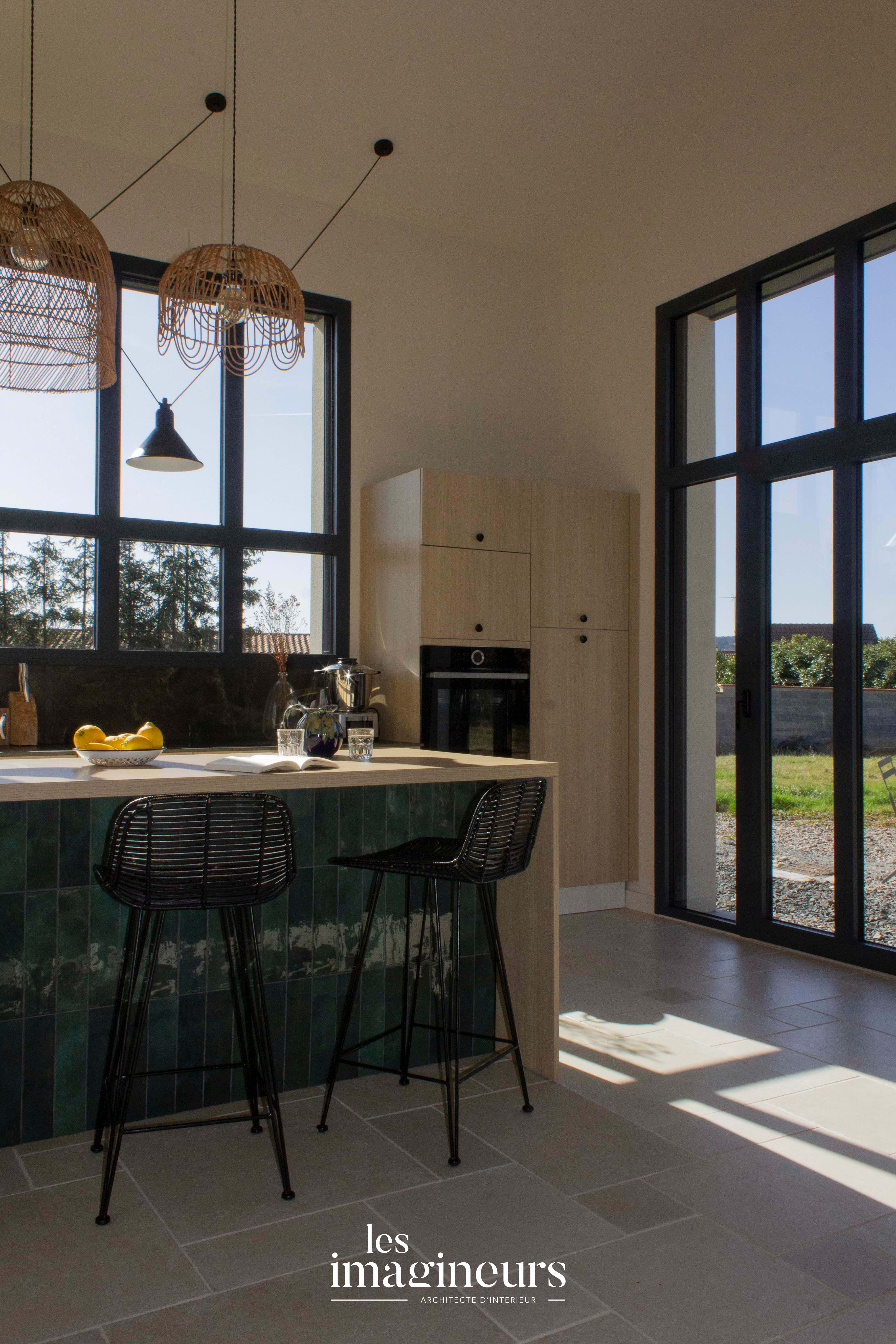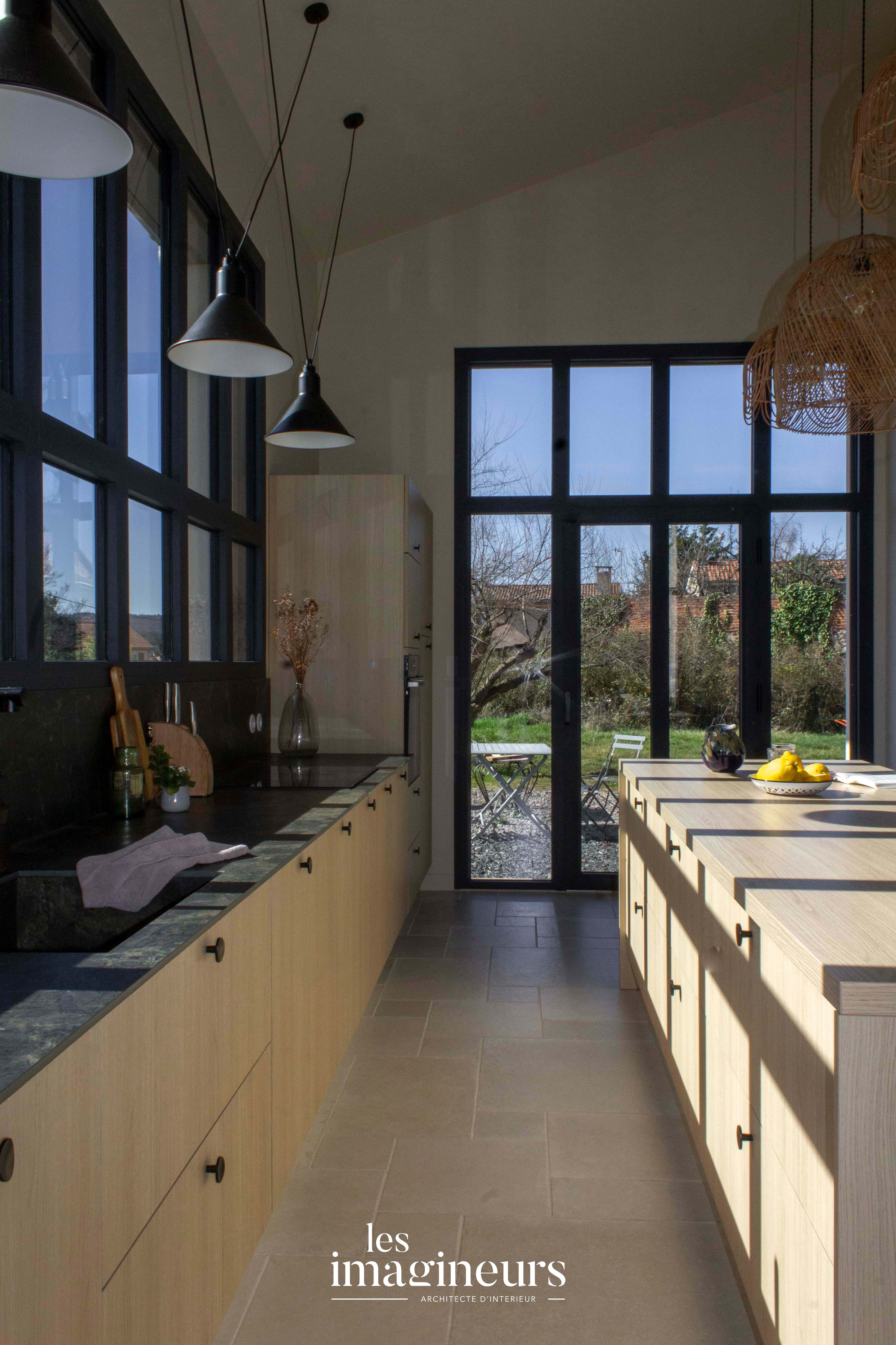 Une résidence datant des années 70, avec les espaces de vie au premier étage. L’objectif est de retrouver ces pièces de vie au niveau du terrain. Nous procédons à la démolition des planchers du premier étage afin d’aménager le sous-sol avec une hauteur sous plafond majestueuse. Dans le but d’augmenter les volumes, une extension est aménagée pour accueillir la cuisine. Entourée de verrières, elle semble être positionnée au milieu du terrain, idéale pour une vie de famille en plein air. Une fois les espaces ouverts, on apporte du charme en utilisant des matériaux nobles comme le chêne et la céramique travertin. La pose en opus du sol va apporter de la personnalité. Un bel escalier recouvert de béton ciré trouve sa place, mis en valeur par des niches et une structure de rangement sur mesure en chêne, en guise de premières marches. Dans le but de sublimer cette belle hauteur sous plafond, une bibliothèque grandiose est disposée le long du mur du salon.