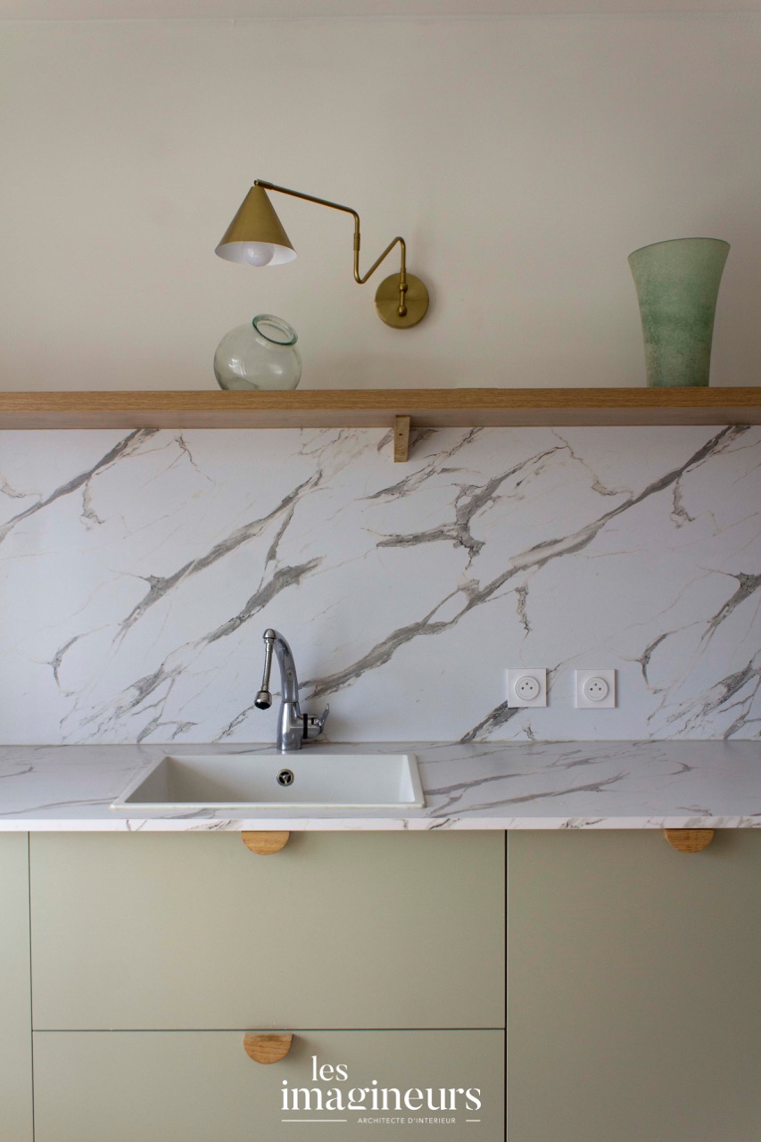 Une cuisine sous un nouveau jour, caractérisée par une combinaison harmonieuse intégrant des éléments en marbre veiné, des armoires en bois clair et vert pastel, ainsi que des touches dorées pour une esthétique à la fois élégante et accueillante.