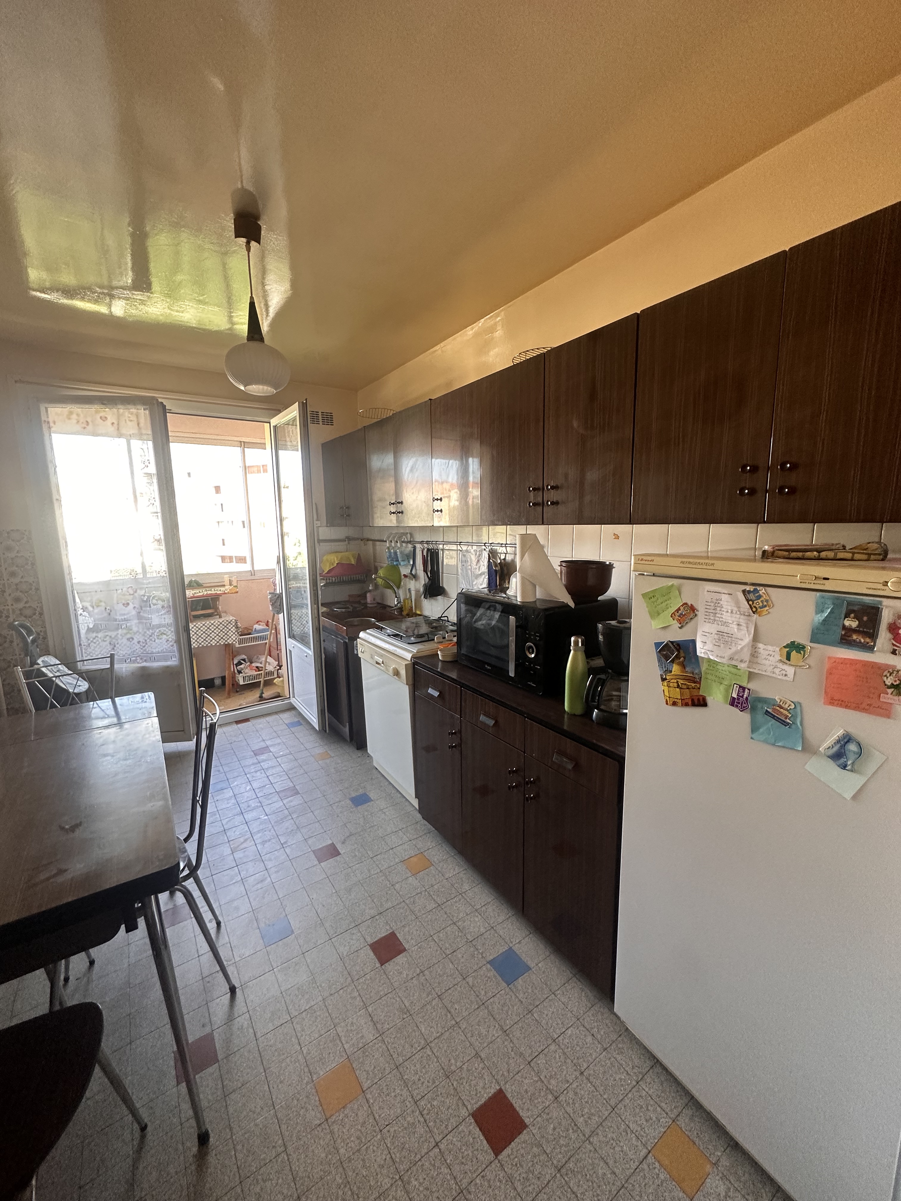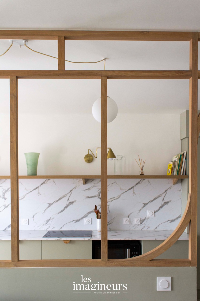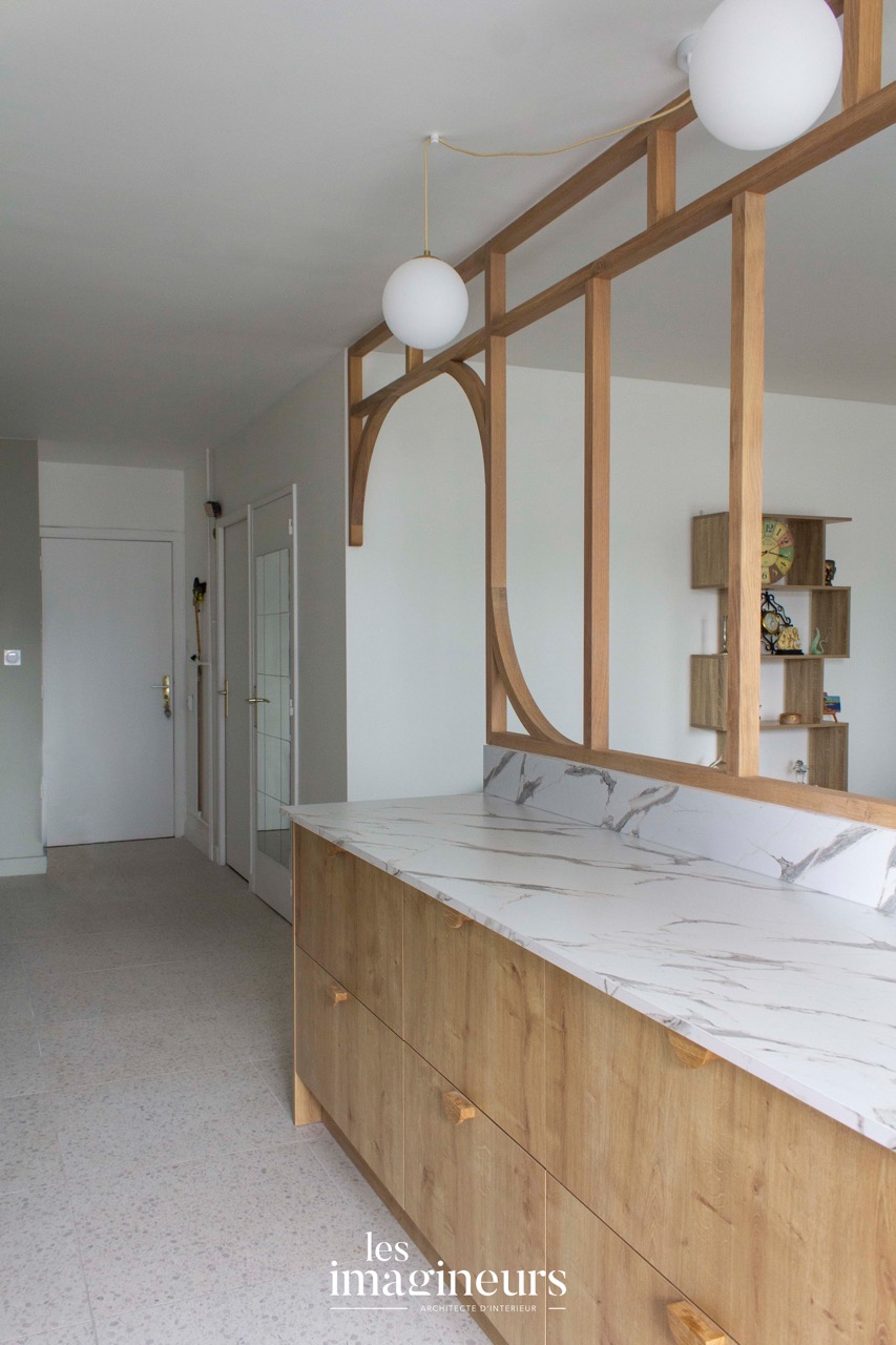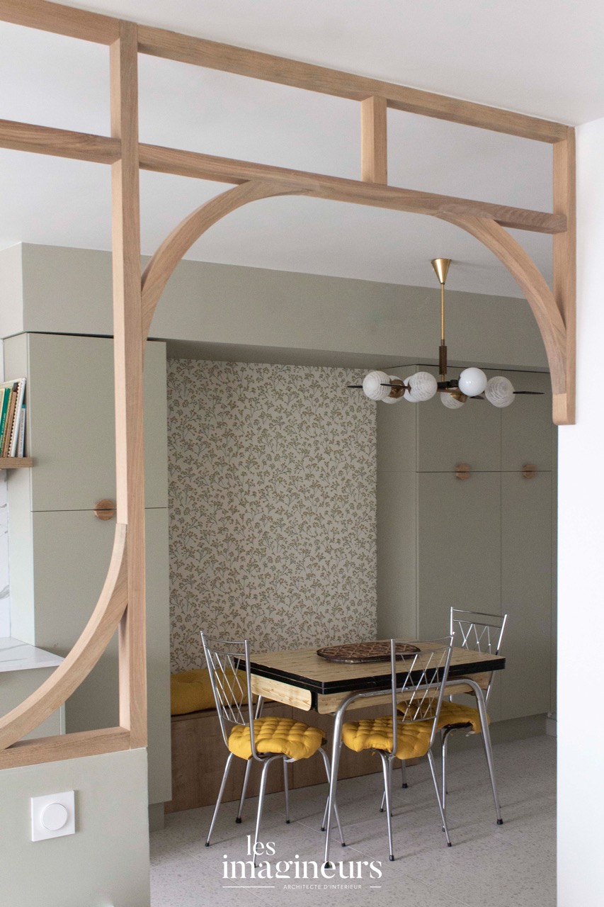 La cuisine, divisée par une cloison semi-ouverte en bois ornée de motifs géométriques arrondis, permet de séparer les espaces tout en maintenant une circulation fluide de la lumière.
