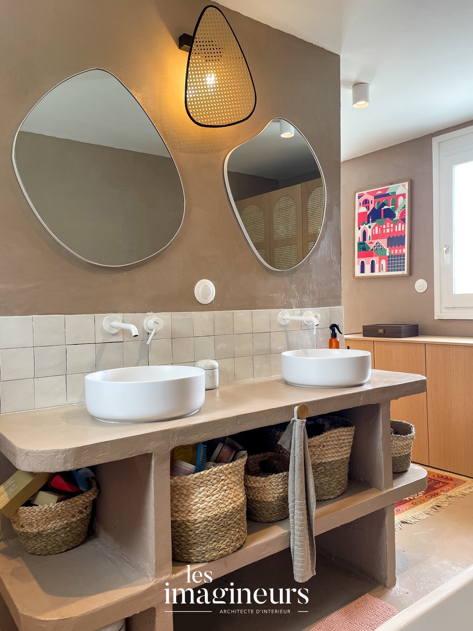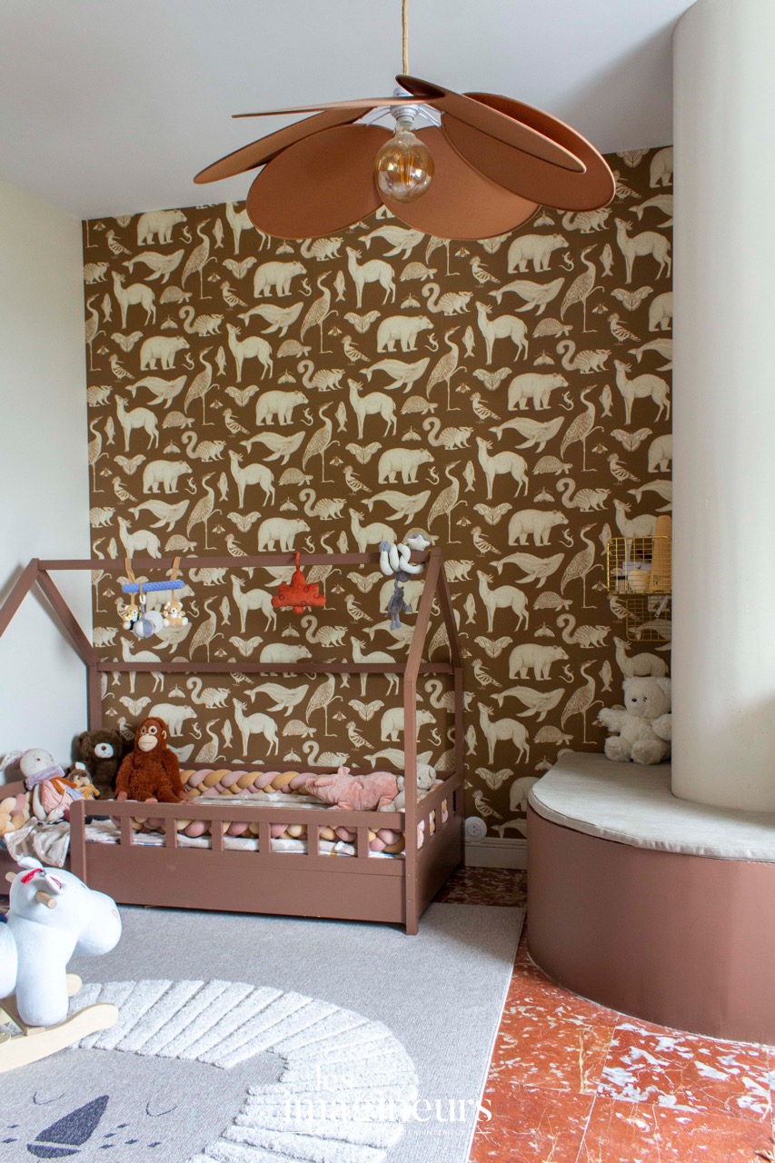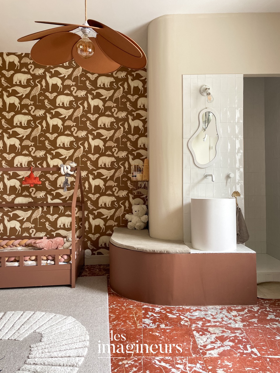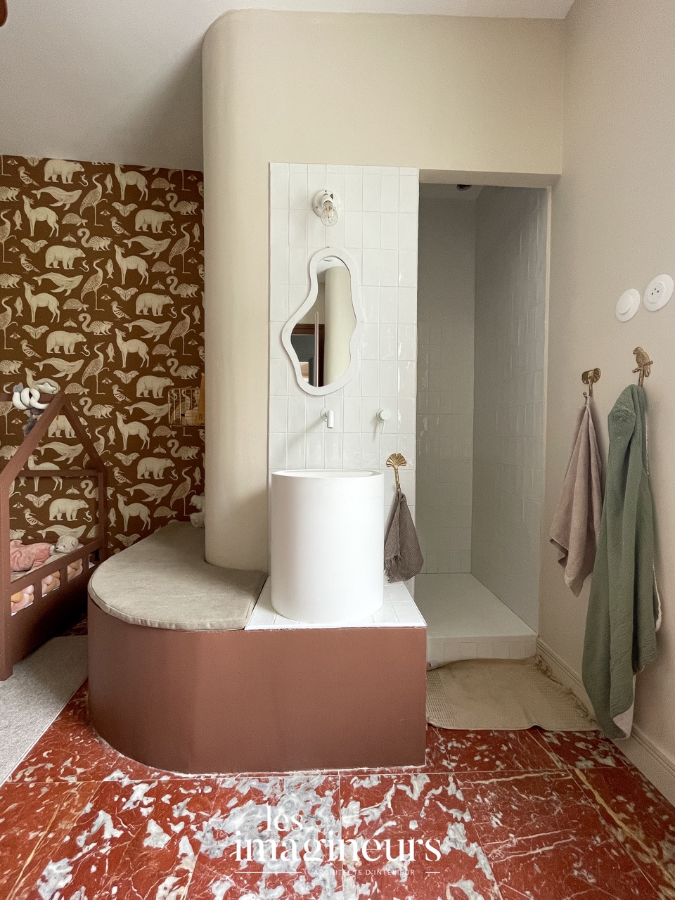 Au 1er étage, La chambre d’enfant est animée par le papier peint « Animals » de Ferm Living, qui apporte une touche ludique. La salle d’eau, avec ses formes douces et courbes, comme le miroir irrégulier, crée un effet artistique et fluide. Le sol en marbre d’origine a retrouvé toute sa splendeur, contrastant avec les teintes douces et les formes apaisantes environnantes.