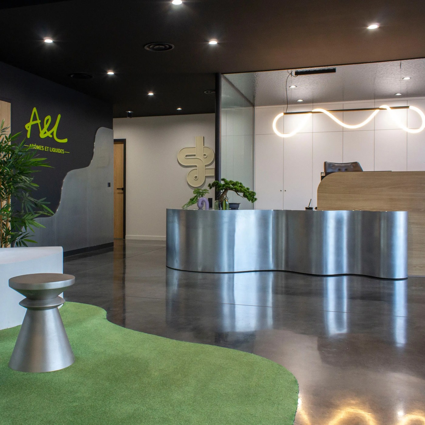 Lorsque Arômes et Liquides a investi ses nouveaux locaux, l’ambition était claire : créer un espace à l’image de son identité visuelle, vibrant et inspirant. Pour donner vie à cette vision, l’équipe des Imagineurs a conçu un aménagement où chaque détail reflète l’univers de la marque.