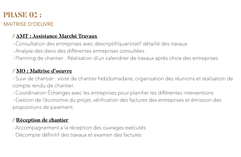 Honoraires basés sur un pourcentage du montant total HT des travaux, suivant le type de projet et sa localisation.